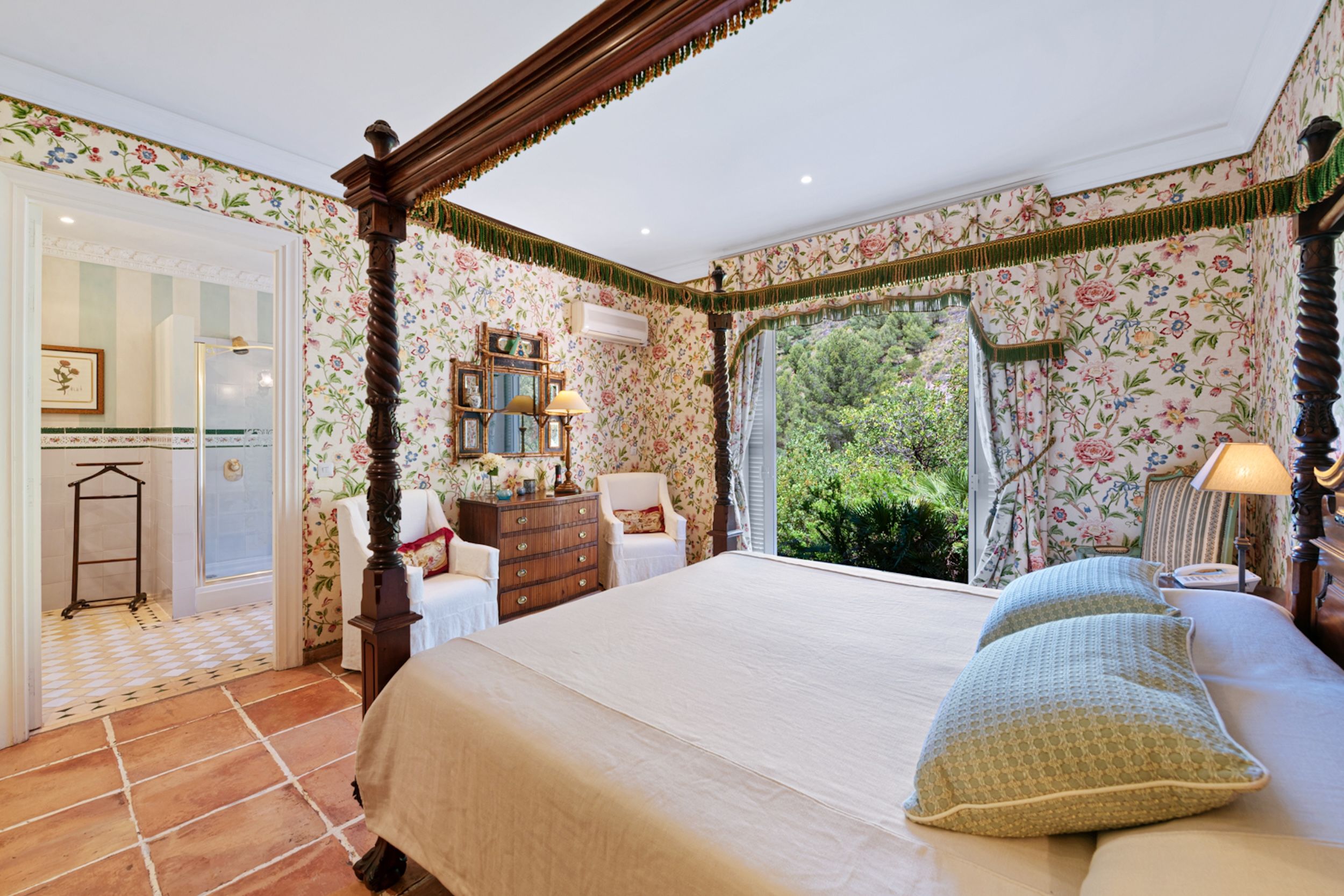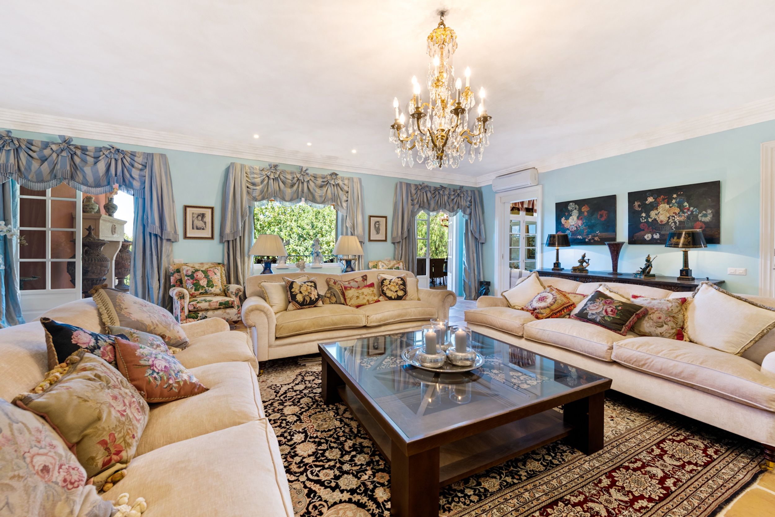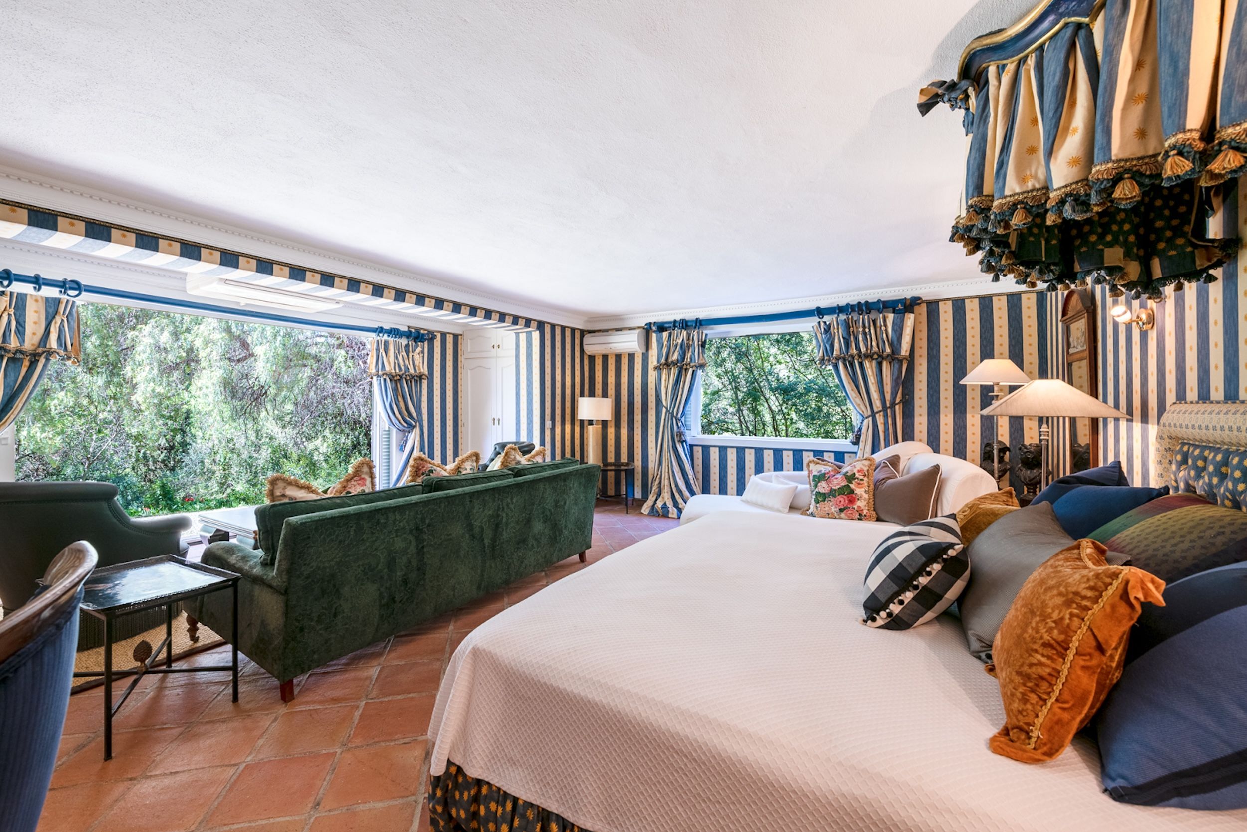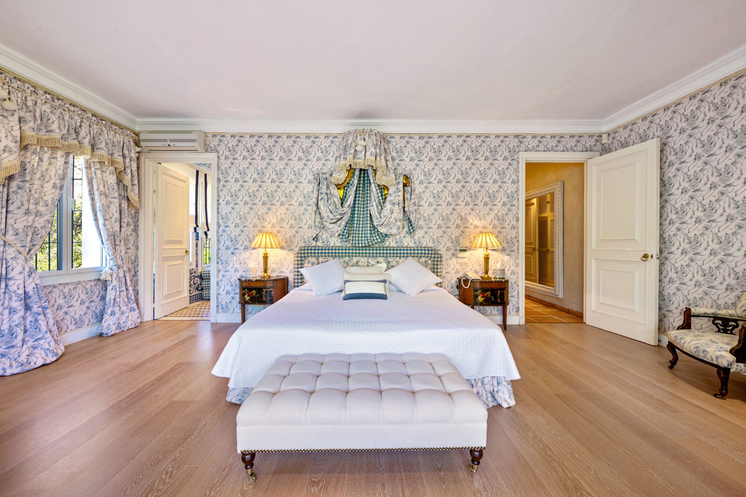 The estate comprises four distinct structures: the main house, a pool house, a guest house, and separate staff quarters. All residences are immaculately maintained and richly detailed, with interiors featuring hand-painted bathroom tiles and furniture, exclusive fabric wall coverings, underfloor heating, and independent climate control systems. Every bedroom has been designed to offer maximum privacy and comfort, with ensuite bathrooms and refined design finishes.