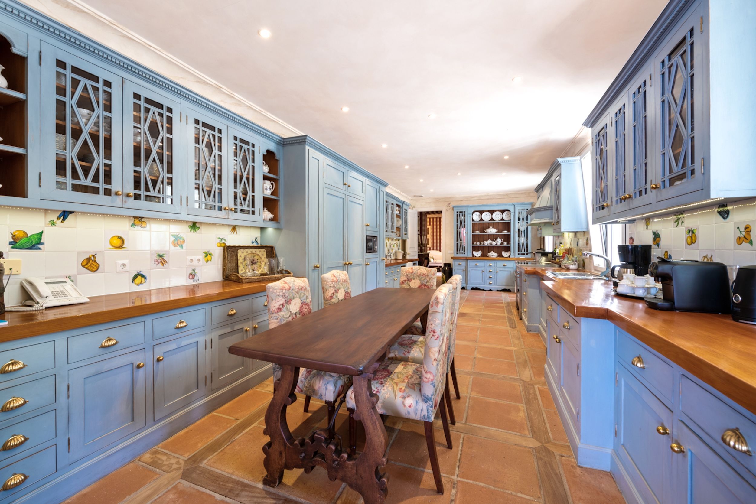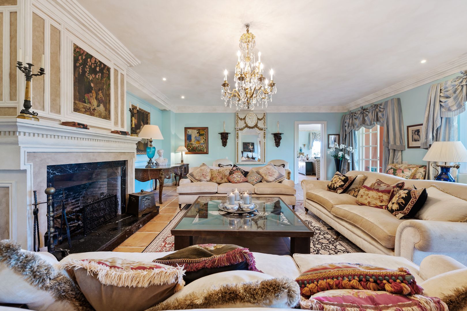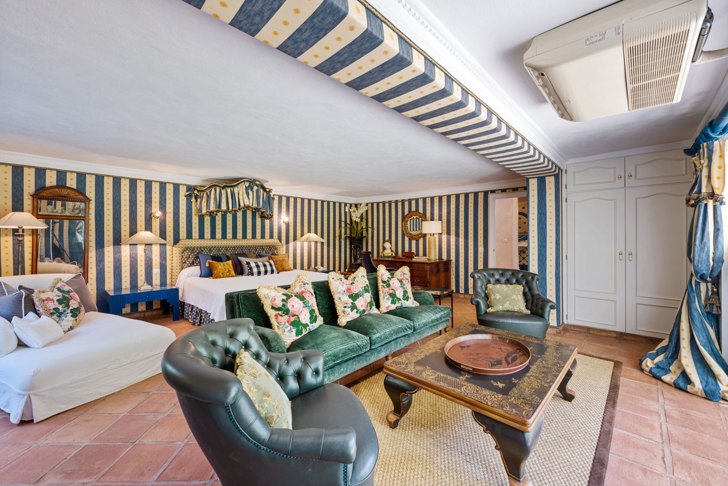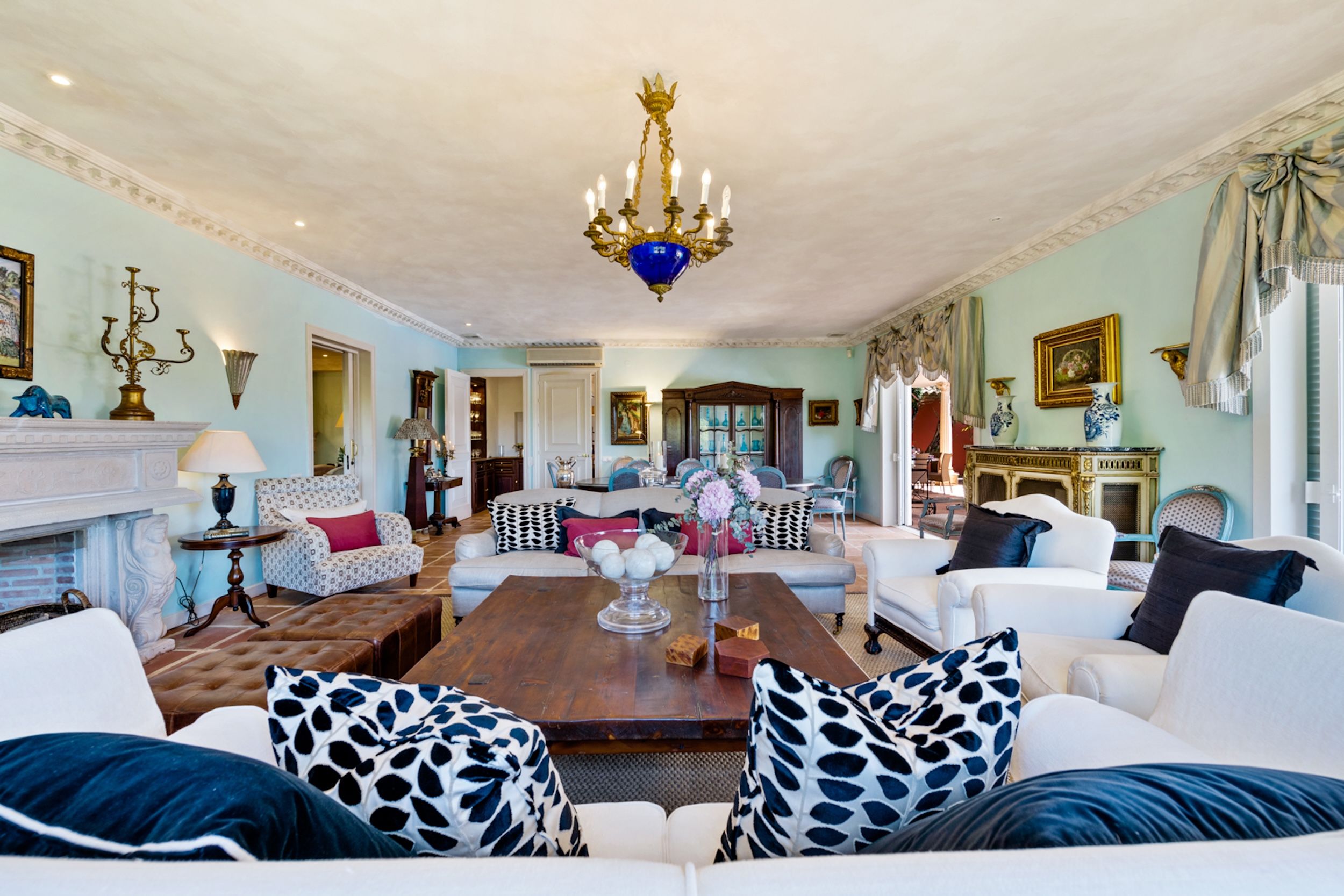 The estate comprises four distinct structures: the main house, a pool house, a guest house, and separate staff quarters. All residences are immaculately maintained and richly detailed, with interiors featuring hand-painted bathroom tiles and furniture, exclusive fabric wall coverings, underfloor heating, and independent climate control systems. Every bedroom has been designed to offer maximum privacy and comfort, with ensuite bathrooms and refined design finishes.