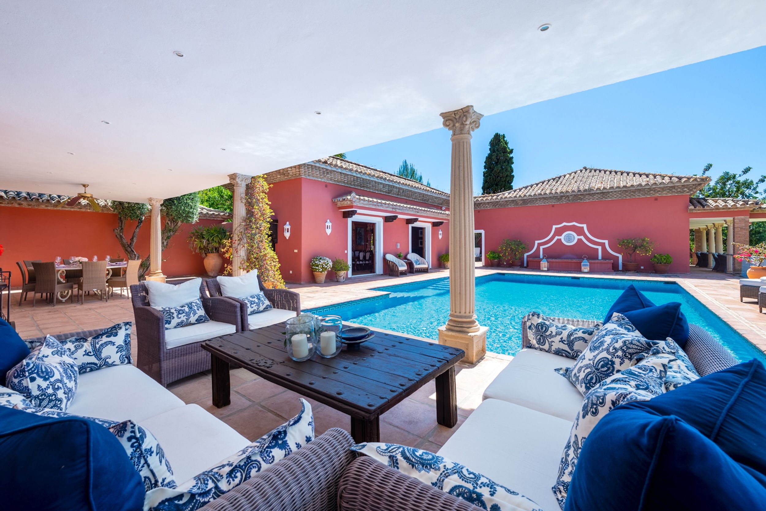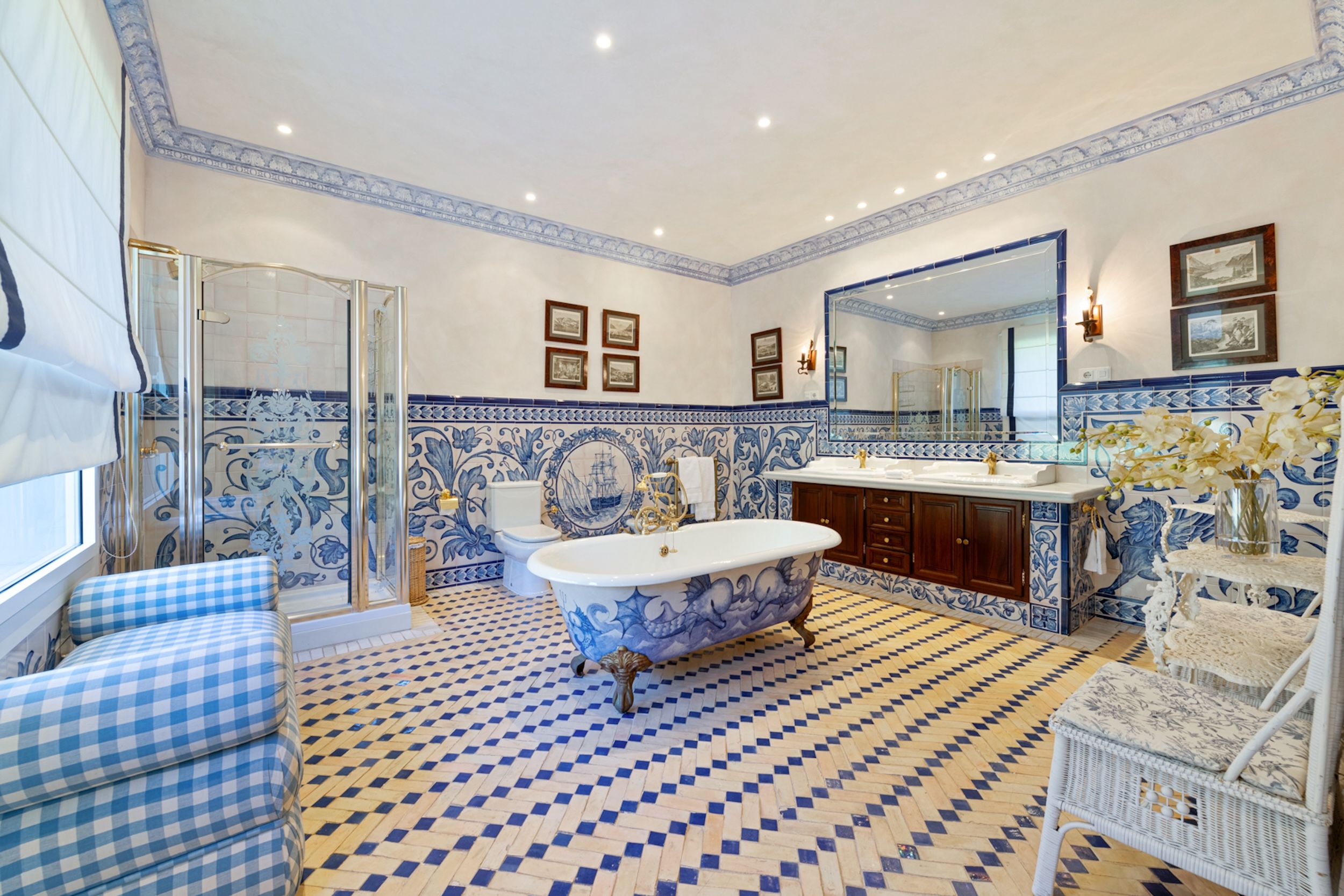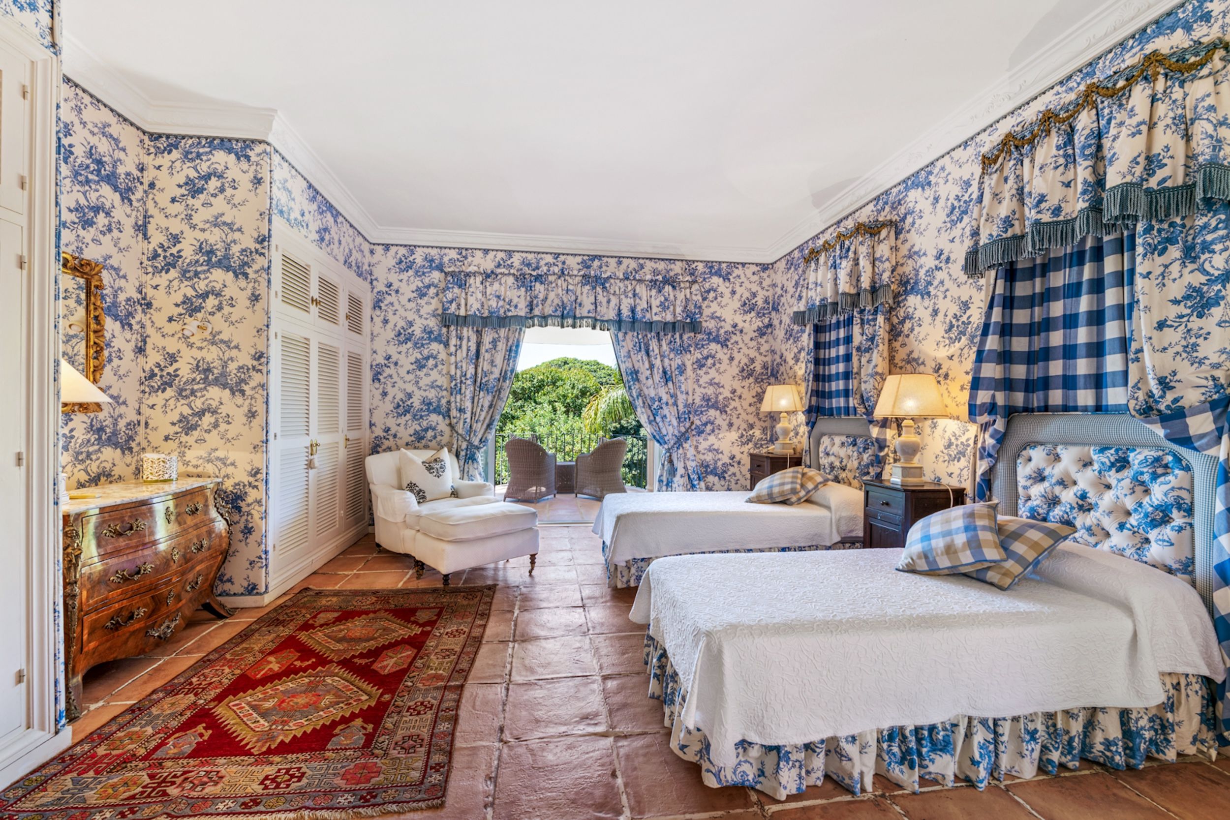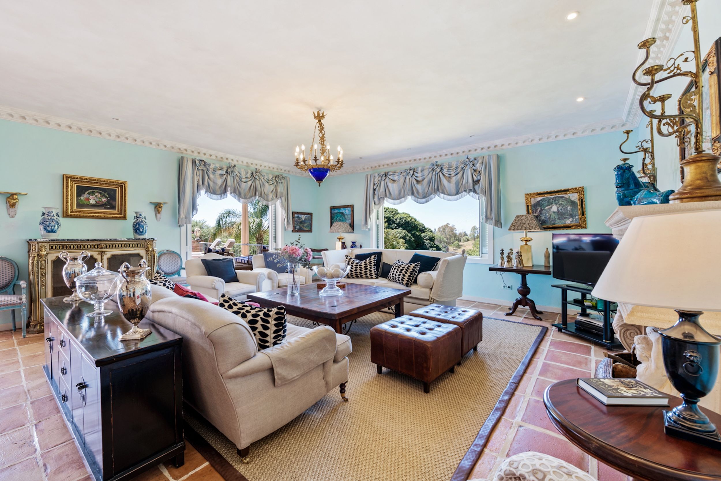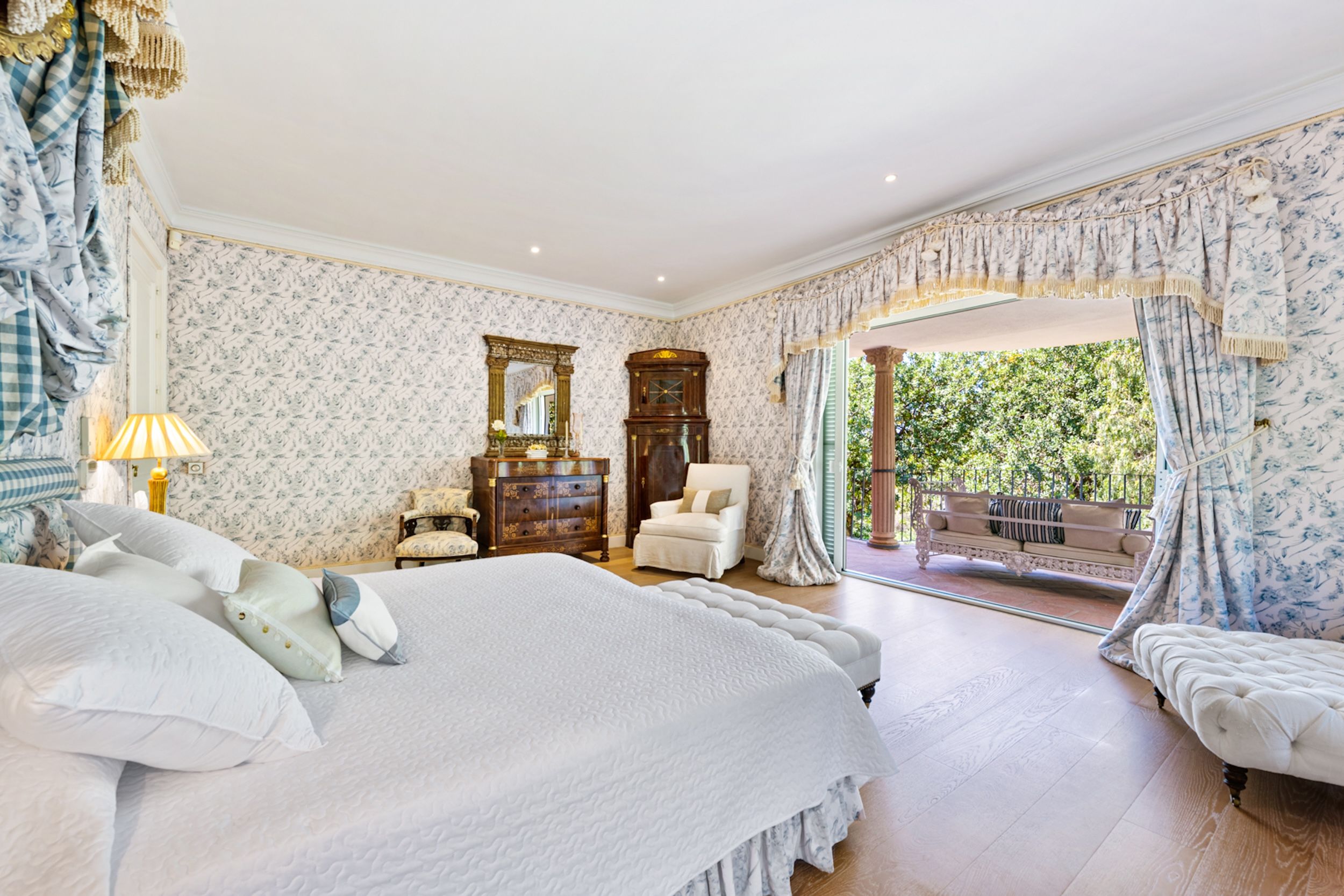 The estate comprises four distinct structures: the main house, a pool house, a guest house, and separate staff quarters. All residences are immaculately maintained and richly detailed, with interiors featuring hand-painted bathroom tiles and furniture, exclusive fabric wall coverings, underfloor heating, and independent climate control systems. Every bedroom has been designed to offer maximum privacy and comfort, with ensuite bathrooms and refined design finishes.
