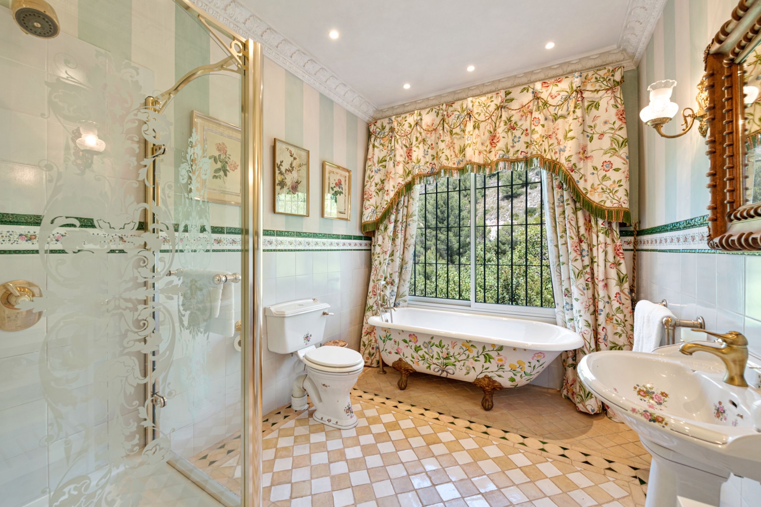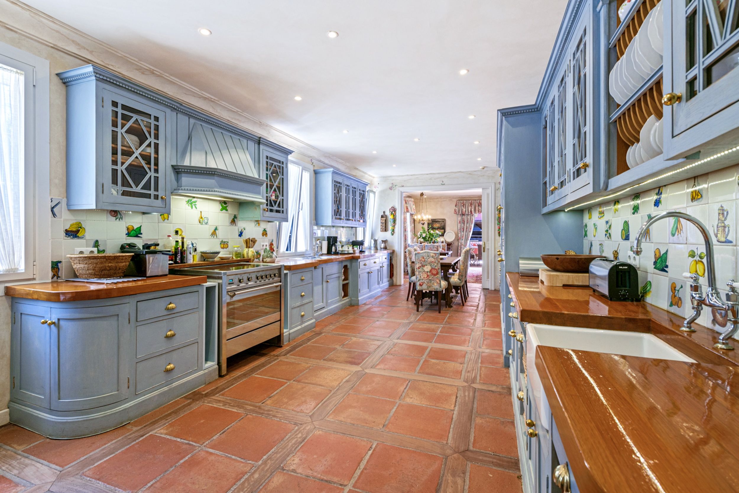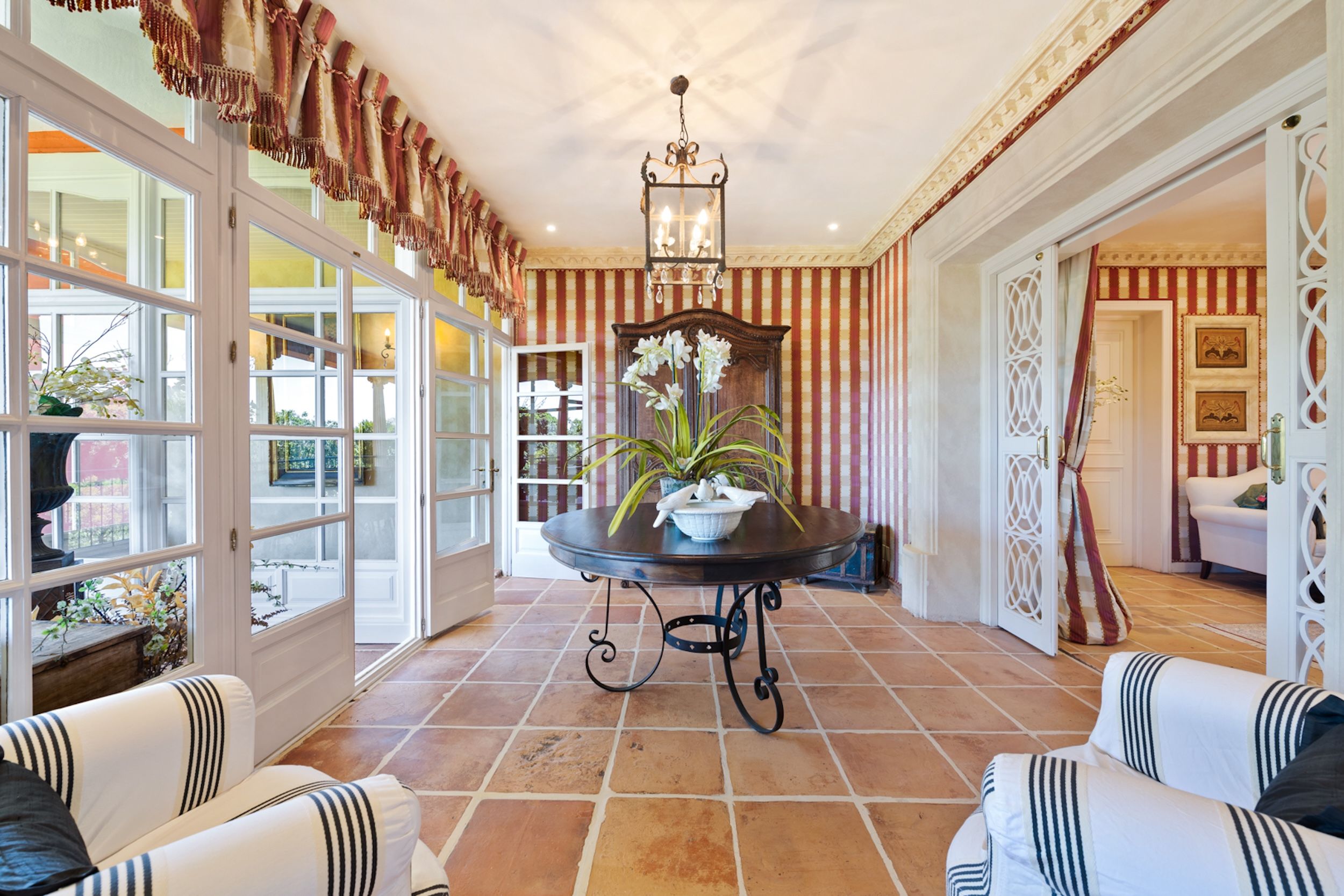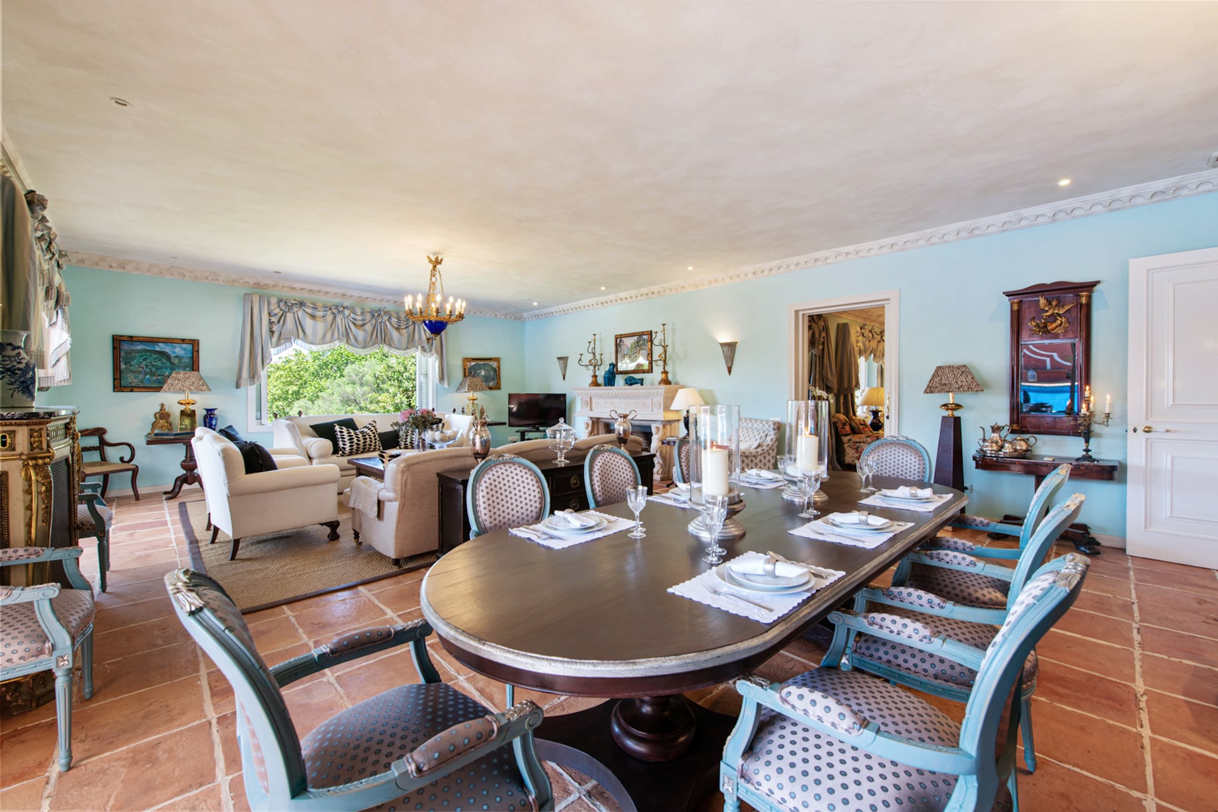 The estate comprises four distinct structures: the main house, a pool house, a guest house, and separate staff quarters. All residences are immaculately maintained and richly detailed, with interiors featuring hand-painted bathroom tiles and furniture, exclusive fabric wall coverings, underfloor heating, and independent climate control systems. Every bedroom has been designed to offer maximum privacy and comfort, with ensuite bathrooms and refined design finishes.